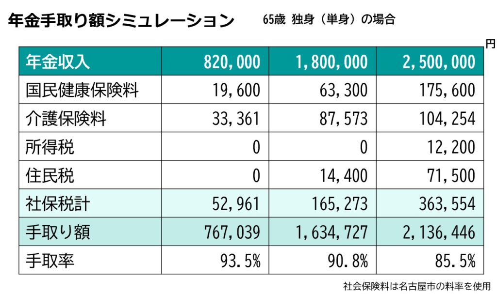 下記の表は、65歳独身、社会保険料は名古屋市のものを使用してシミュレーションしています。