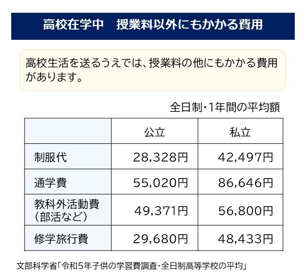 高校生活を送るうえでは、授業料の他にもかかる費用があります。